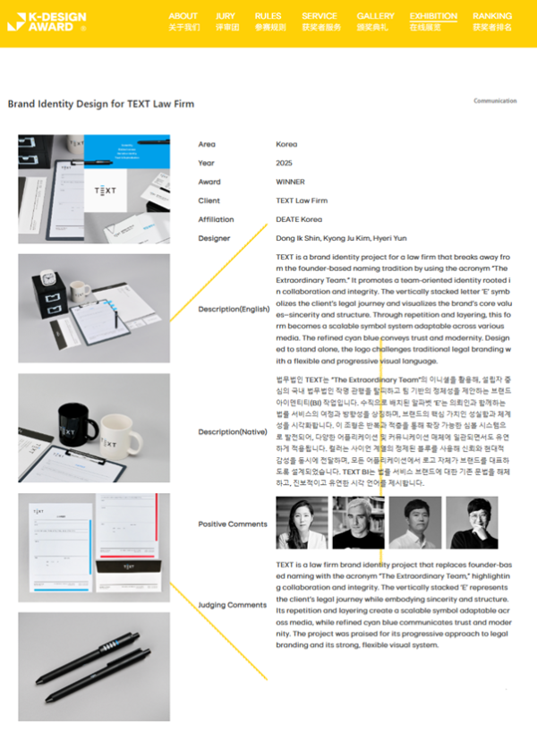 법무법인(유한) 텍스트의 로고와 브랜드를 디자인한 DEATE Korea가 'K-디자인 어워드 2025(K-Design Award 2025)' 에서 Communication 부문 위너(Winner)를 수상했습니다. 이전까지 법무법인 브랜드로 수상한 사례는 없었습니다.